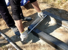 Разложенную брусчатку мы зафиксировали заранее изготовленной металлической рамкой, после чего засыпали пескобетонной смесью.